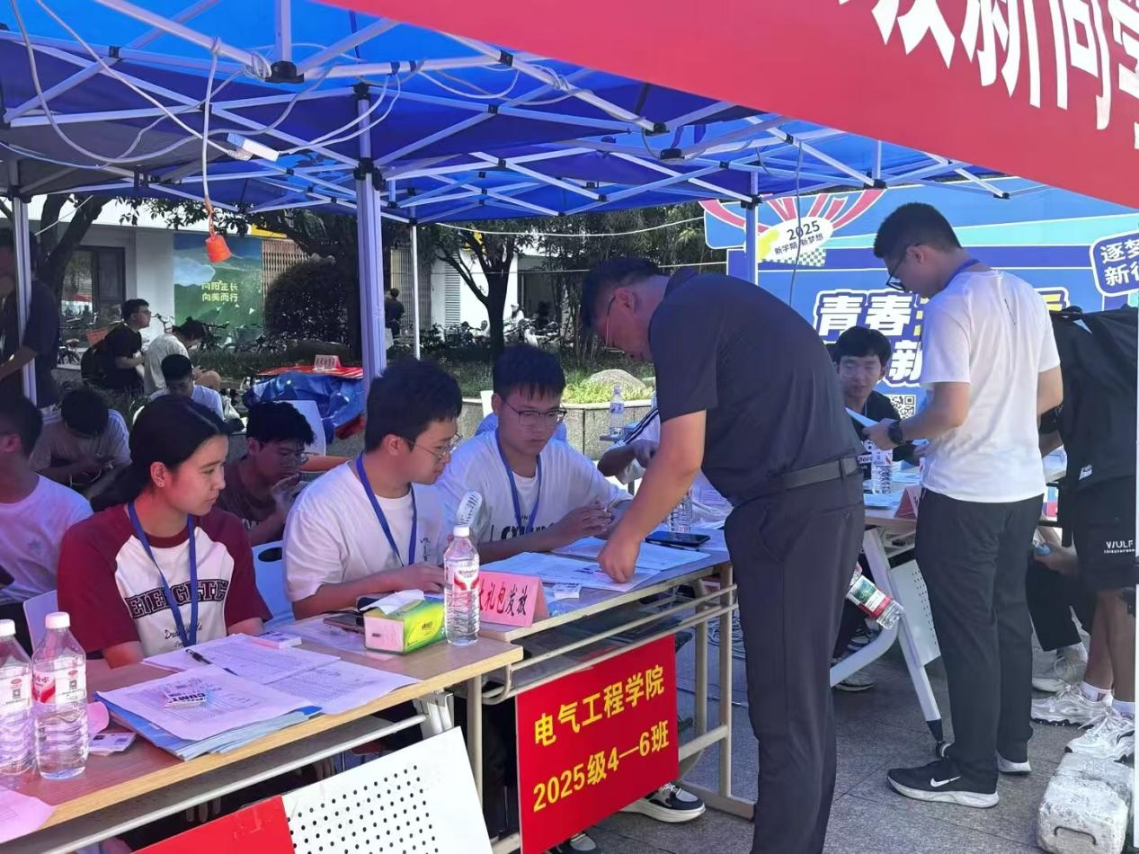 为确保迎新期间优质服务不断线,我院安排志愿者24小时值守,从前期布置现场、打包新生大礼包,到迎新当天顶着烈日引导新生前往学院迎新点、协助新生及家长搬运行李,确保顺利入住宿舍,志愿者们始终以热情洋溢的姿态为迎新工作保驾护航,展现了电气学子“传帮带”的优良传统。