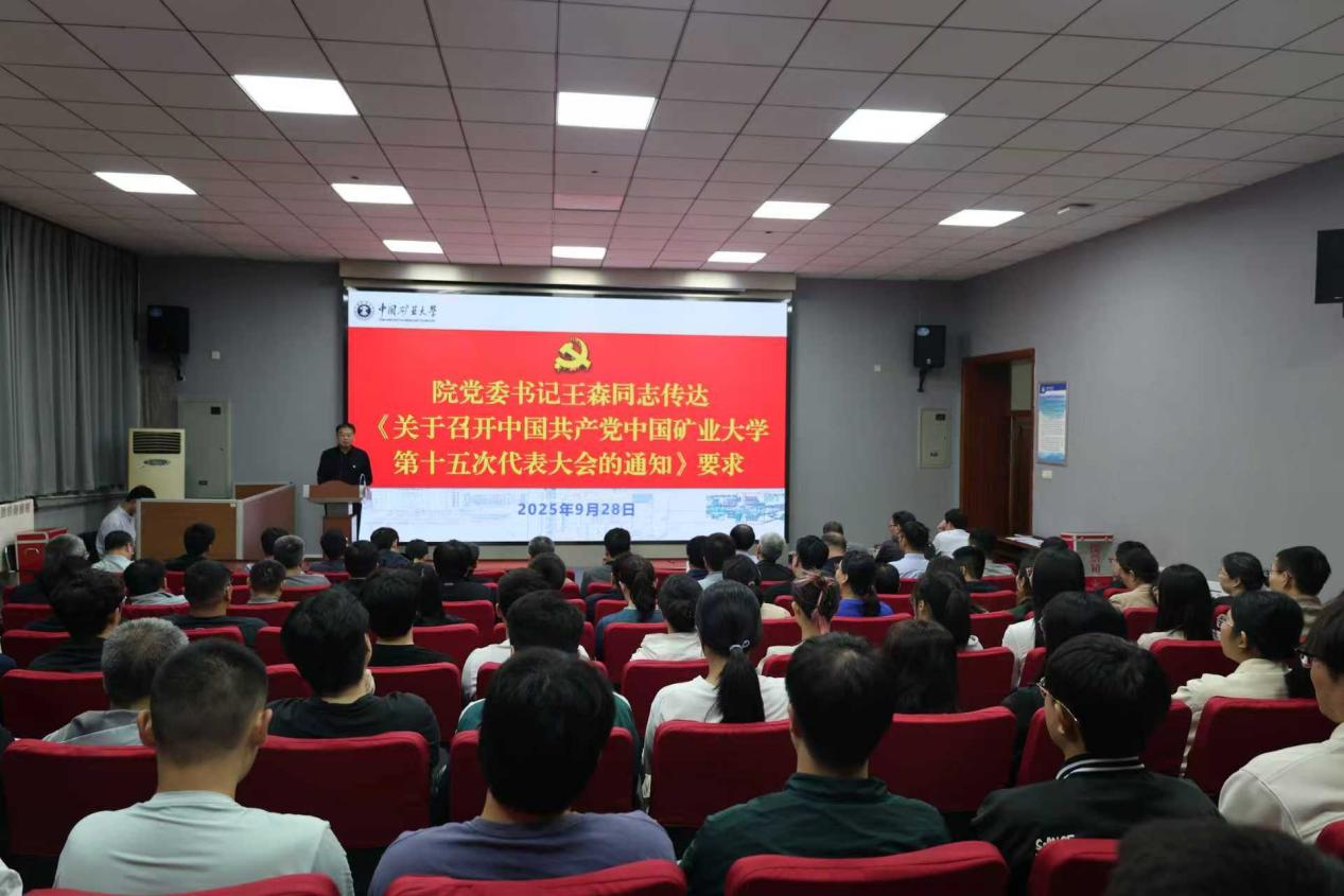 大会在庄严的国歌声中拉开帷幕。会上,院党委书记王森同志首先传达了《关于召开中国共产党中国矿业大学第十五次党员代表大会的通知》要求。他从大会指导思想、主要议程、代表推荐及产生条件等方面进行介绍,强调了此次选举工作的重要性和严肃性,要求按照组织程序,认真选举出我院的党员代表。