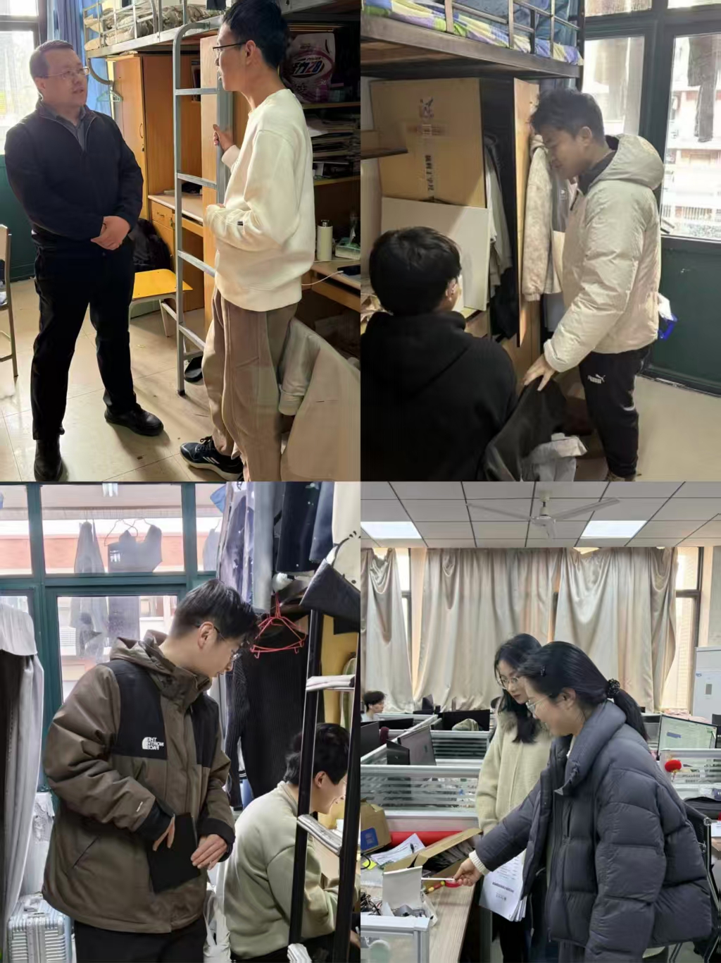 检查过程中,老师们叮嘱大家要增强安全意识,并对学生宿舍阳台堆积杂物、宿舍楼私拉电线、寝室内安全用电、消防设施等做了重点排查。对部分存在安全隐患的学生宿舍,各年级辅导员均进行了整改与回访工作。走访过程中,老师们与在寝学生进行交流,询问他们在校学习和生活方面的相关情况,鼓励大家积极向上、努力进取。