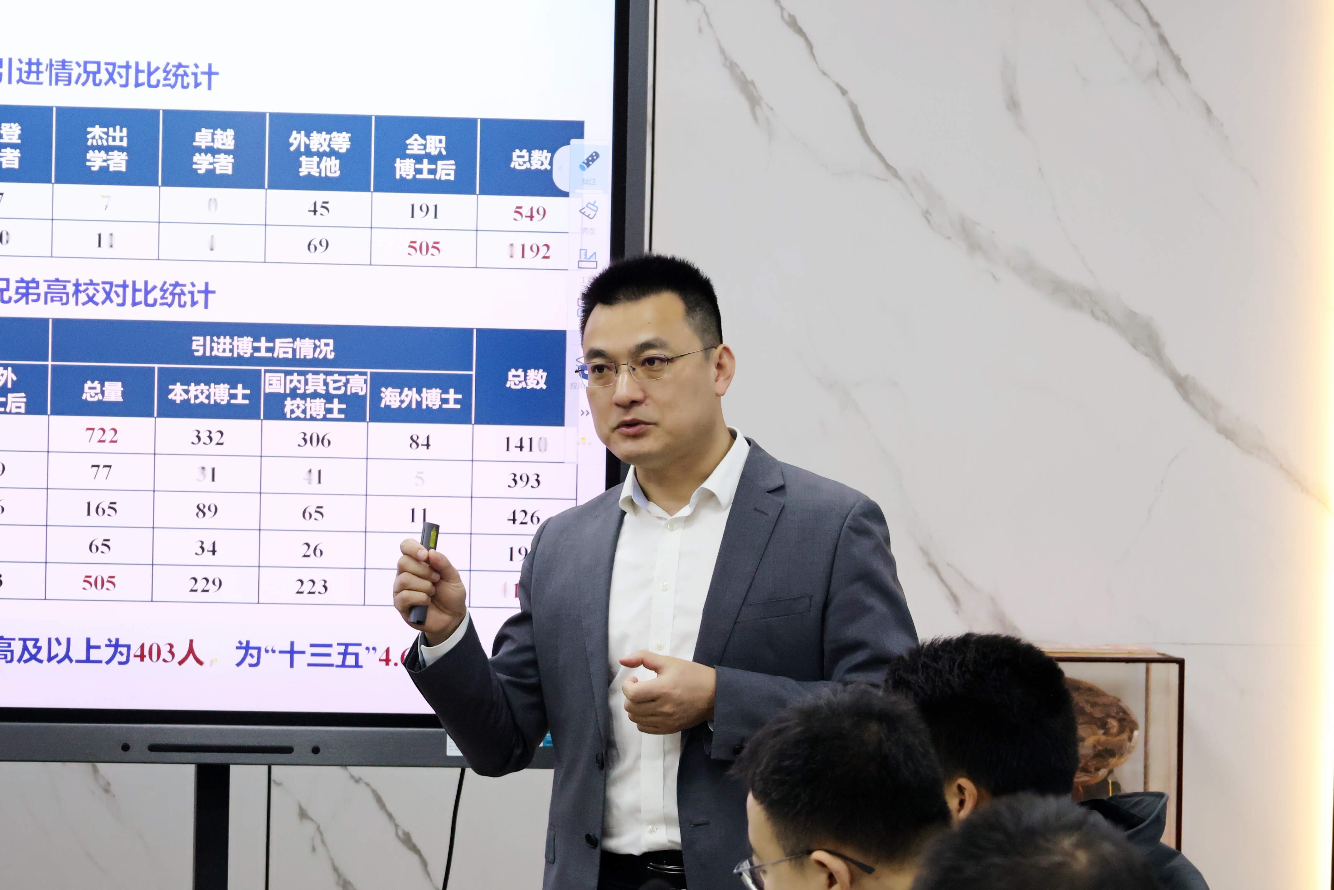 王森代表学院对人力资源部长期以来的支持致以诚挚谢意。他表示,此次会议使学院对学校“十五五”人才强校的总体部署、青年人才成长路径以及师德底线要求等方面有了更系统的认识,为学院下一阶段人才工作提供了清晰指引。他要求全体院领导以当前正在深化的政绩观教育为契机,深刻领会“功成不必在我、功成必定有我”的精神实质,将人才工作成效作为衡量履职担当的重要标准。同时,他强调要始终把师德师风建设摆在首要位置,坚持师德第一标准,推动教师以德立教、潜心育人,营造风清气正的育人生态。学院将按照学校统一部署,持续凝练学科重点方向,加大人才引进与青年教师培养力度,努力在高端人才引育上取得新进展,加快形成更具竞争优势的人才发展格局,真正实现“人人皆可成才、人人尽展其才”。