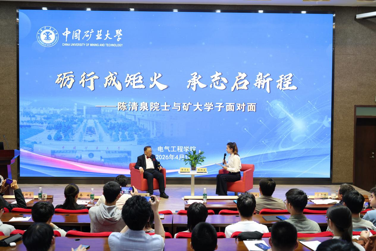 4月19日下午,“砺行成炬火 承志启新程”——陈清泉院士与矿大学子面对面交流活动在南湖校区图书馆报告厅顺利举办。中国工程院院士陈清泉教授应邀出席,与矿大青年学子共话科研初心、共探能源未来。深港院士科创中心理事长兼主任岳媛,学校教务部副部长、能源学院副院长周来,电气工程学院党委副书记李志峰、副院长于东升、关工委常务副主任张同庄,学院全体专兼职辅导员,以及陈清泉班2023级、2024级、2025级全体学生,电气工程学院、能源学院、孙越崎学院、机电学院学生代表共200余人参加活动。