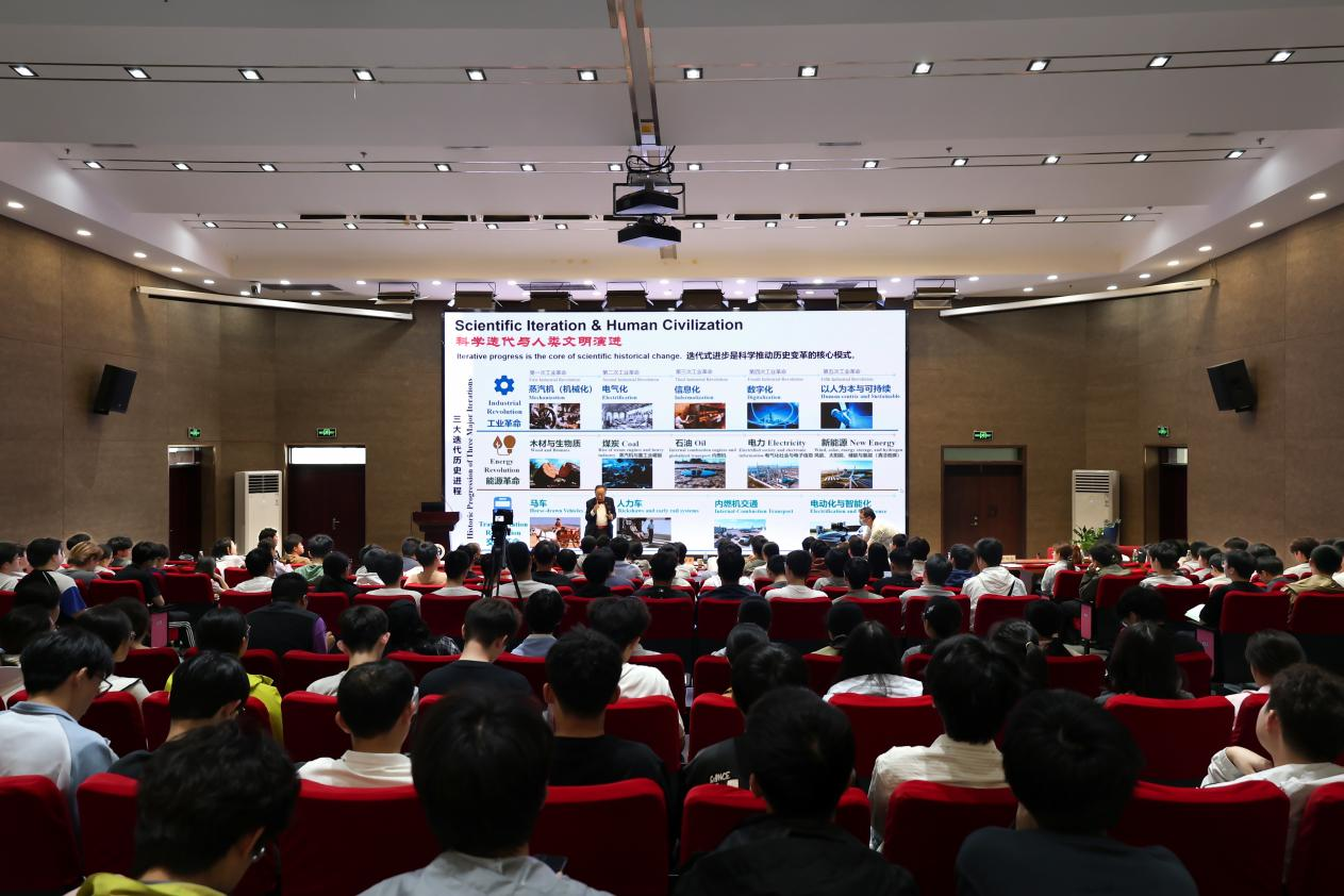 活动中,陈清泉院士首先作“胸怀祖国 勇攀高峰”主题报告。报告紧扣科学迭代、工程哲学、能源革命、汽车变革等核心议题,系统阐释科学迭代与人类文明演进规律,深刻解读“化知为行”的工程哲学内涵,全面剖析新时代能源革命面临的挑战,清晰阐明新型电力系统的核心特征,并创新性提出汽车工程三大新定律。他强调,新时代要大力发展高科技、高效能、高质量的绿色新质生产力,能源革命的核心路径在于低碳化、智能化、电气化与氢能深度融合。他以“激情、想象力、创新、集成、实现、投资”六个“I”勉励全体师生,坚守科研初心、勇闯创新无人区,以科技成果创造更大社会价值,彰显了老一辈科学家胸怀祖国、服务人民的赤子情怀。