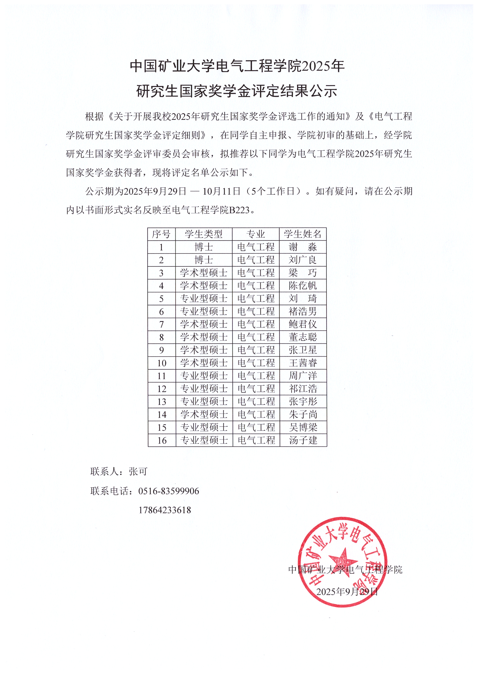 电气工程学院2025年研究生国家奖学金评定结果公示