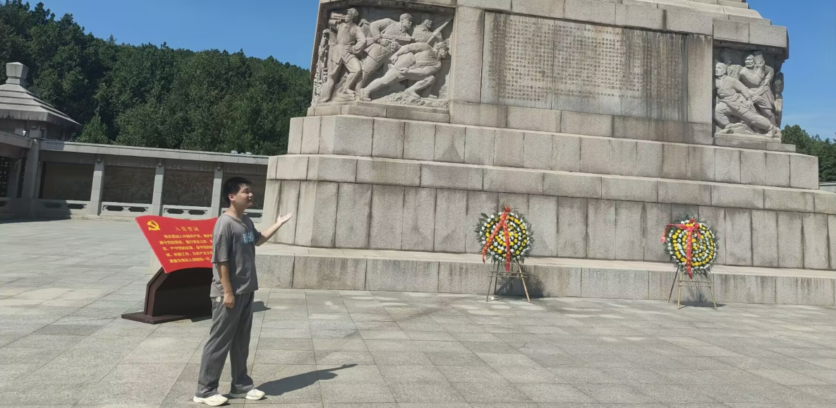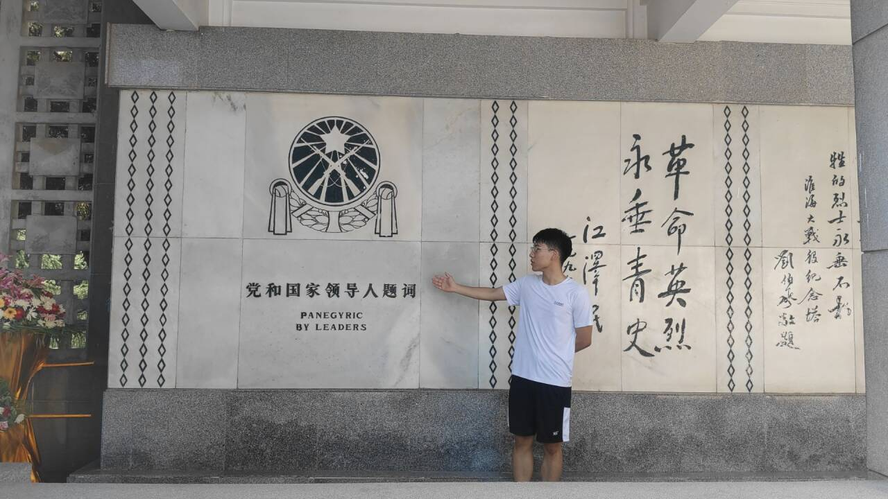 在淮海战役烈士纪念塔旁的回廊区域,团队成员张嘉珅以讲解员身份,向在场员工详细介绍回廊上的题词。他指着墙面镌刻的题字逐一讲解:这些题词字里行间,既饱含对淮海战役胜利的高度肯定、对牺牲英烈的深切缅怀,也承载着对传承革命精神的殷切期望;内容既赞扬了战役中军民团结、奋勇拼搏的英雄壮举,也嘱托后人铭记历史、继往开来。每一笔题词都凝聚着对这段革命历史的深刻感悟,成为传承红色基因、赓续精神血脉的生动教材。
