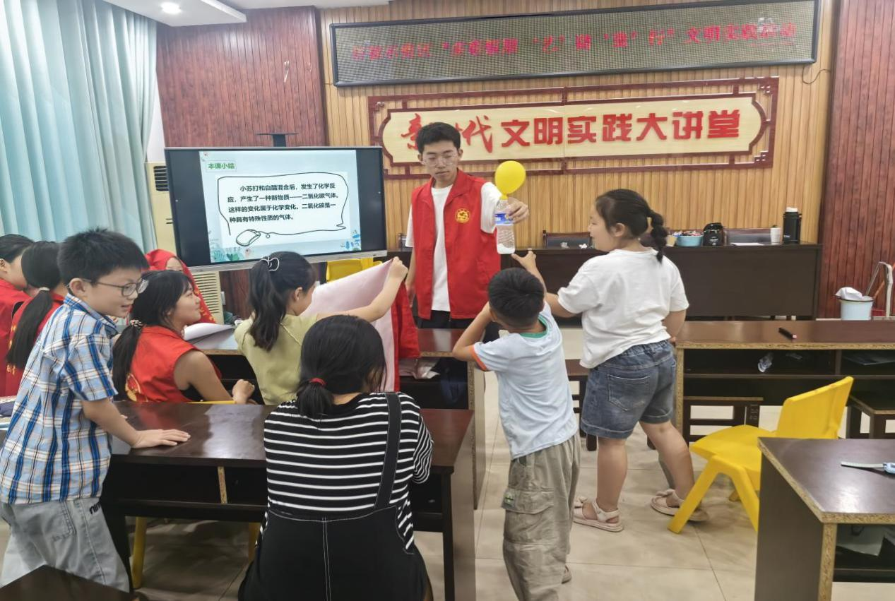 在梨林镇新时代文明实践所,何兴杰团队与其他大学生志愿者紧密协作,首先以扎实的课业辅导为基础,协助孩子们解决暑期作业中的疑难问题。在此基础上,团队充分发挥成员各自特长,推出一系列特色课程:作为团队核心的何兴杰主导“趣味物理” 课程,通过 “神奇大气压”“淘气小苏打” 等实验,引导孩子们在动手操作中直观感受科学的奇妙之处;同时,团队还参与其他志愿者主导的草帽彩绘、趣味口才、书法、活力运动等课程,陪伴孩子们用颜料装点草帽、用绕口令锻炼语言表达能力、用笔墨感受中华优秀传统文化、用运动释放青春活力。
