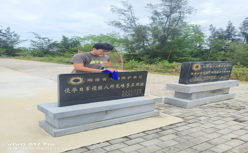 2025 年 8 月 15 日,侵华日军侵琼八所死难劳工纪念地举行了一场庄重的志愿缅怀活动。林尊团队志愿者林尊于当日 11 时抵达纪念地,通过清扫纪念地、向纪念碑献花等行动,表达对历史的铭记与对死难劳工的深切缅怀。