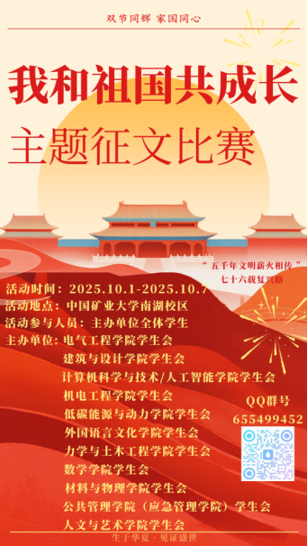 本次国庆征文比赛圆满落下帷幕,同学们用笔尖传递了对祖国的深情以及对时代的思考。虽然征稿的笔尖已然停歇,但矿大学子们在文中流淌的爱国热忱与赤子之心,深深印刻在了每个人的心里。