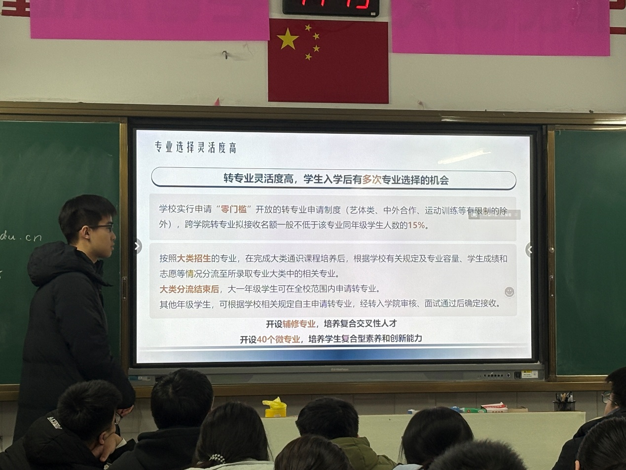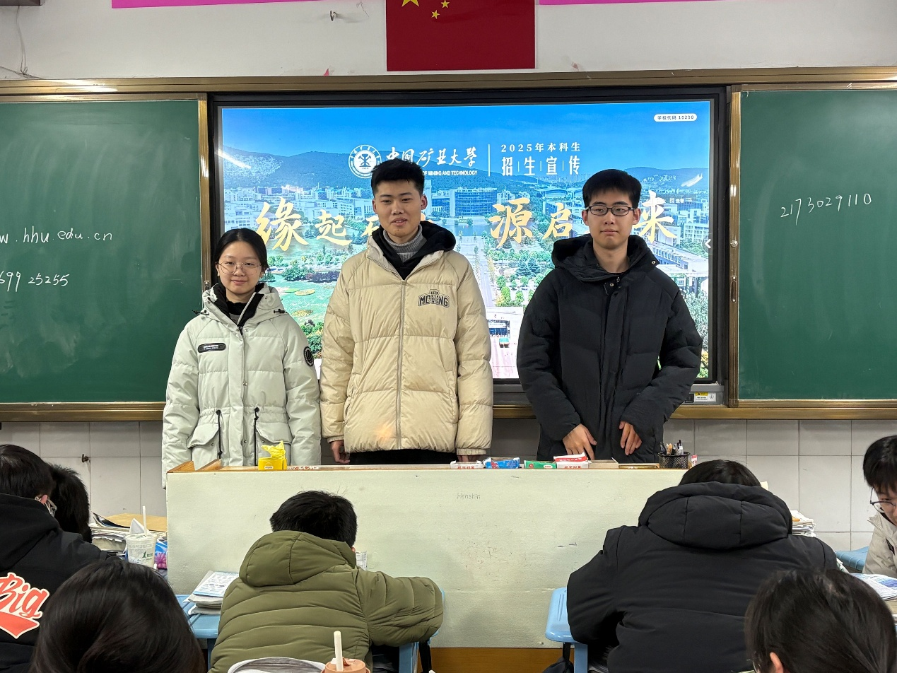 活动开始前,团队进行了任务分配与分工,提前布置宣讲现场。当日下午两点,活动准时开始。首先,两名队员为高三同学们发放了招生宣传册等资料。接着,另外一名队员通过播放学校宣传片、展示PPT等形式,详细讲解了中国矿业大学的历史沿革、著名人物、学科评估、师资力量,以及丰富多彩的校园生活。此外,团队还与在场同学进行了交流互动,给同学们答疑解惑。现场氛围活跃融洽,高三同学们反响热烈。