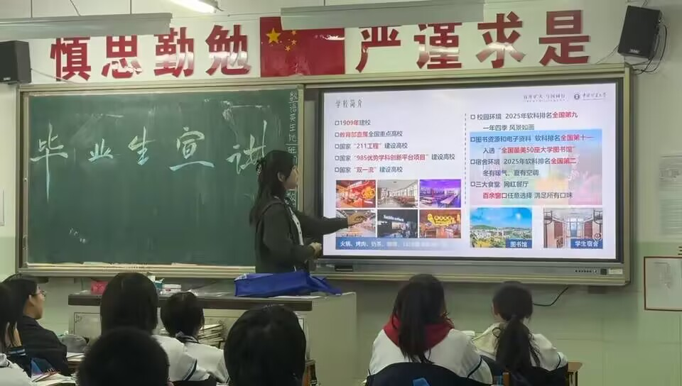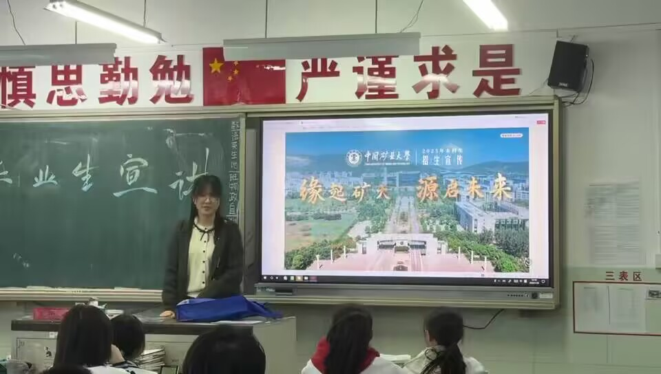 宣讲首先以矿大美丽的校园风景吸引学生兴趣,系统介绍学校的学术实力与学科特色,重点突出在能源资源领域的领先地位与新兴交叉学科的发展;接着分享宣讲者本人在矿大的学习生活感受,包括课程设置、师生互动、宿舍食堂、社团经历等,增强真实性与亲和力;最后展示招生政策,提供实用的报考建议。宣讲结束后设置了问答环节,同学们就专业选择、就业前景、校园生活、升学情况等积极提问,现场气氛热烈。宣讲者结合自身了解与官方信息予以解答。