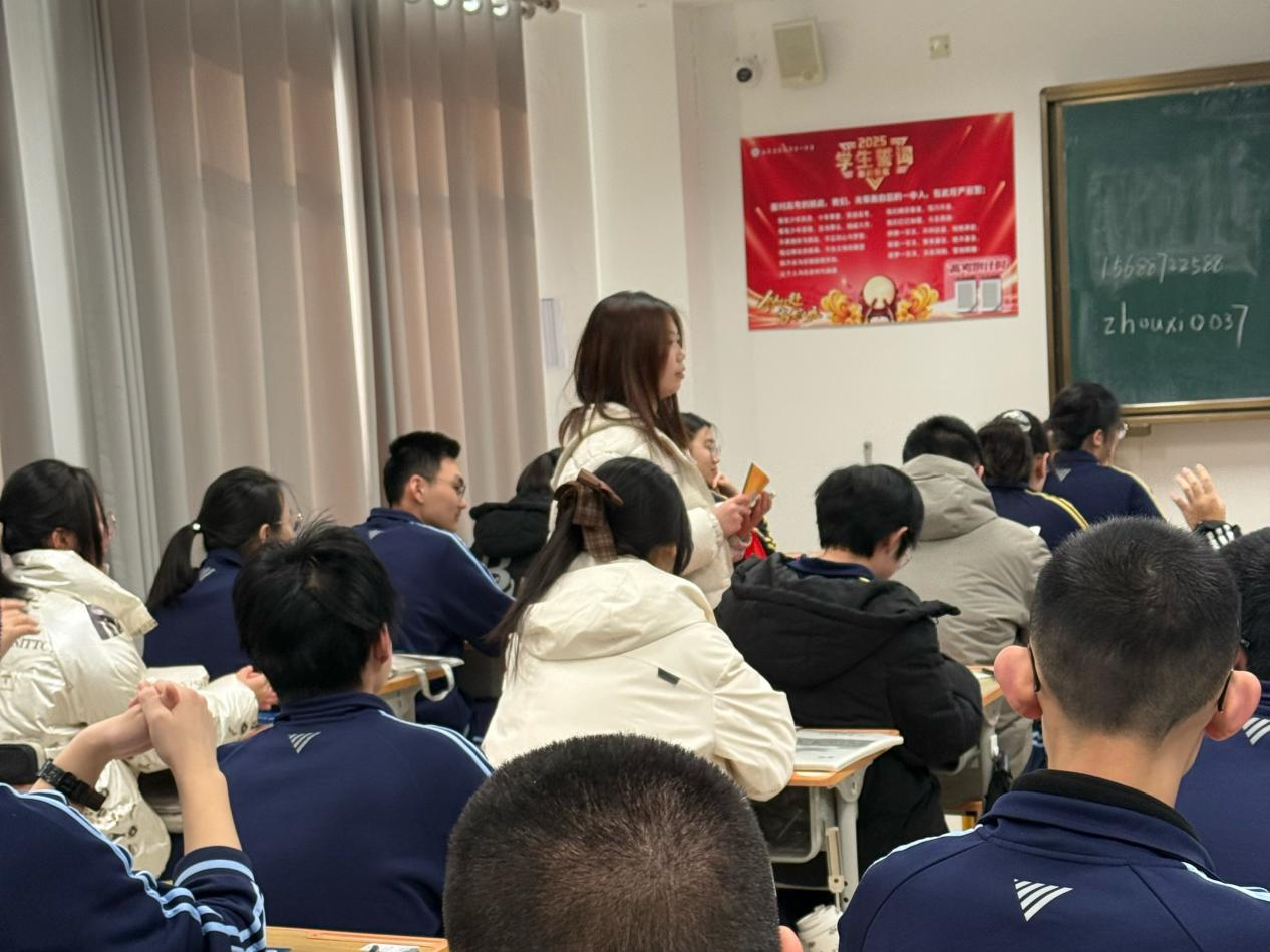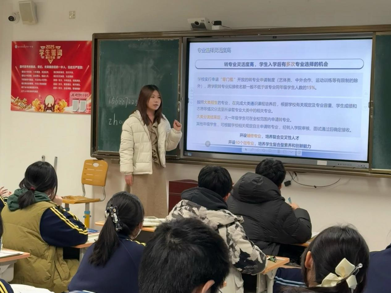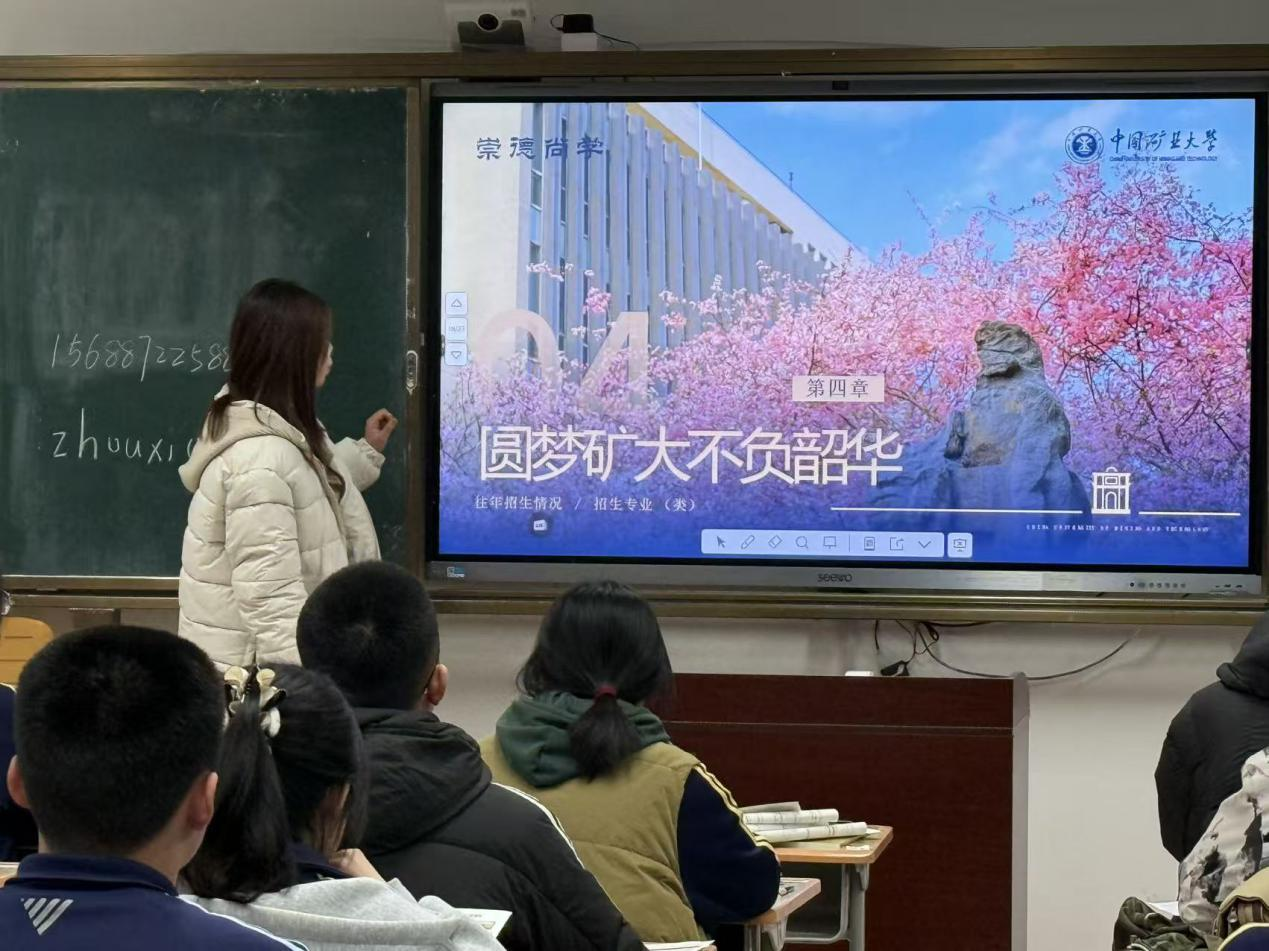 在宣讲过程中,两位同学首先为在场同学们分发招生手册。接着,播放了中国矿业大学招生宣传片,鲜活的镜头全方位展示了矿大的校园风貌、学科建设成果与学子风采,让同学们对学校形成了直观且深刻的印象。随后,两位同学借助PPT,围绕四个模块展开系统讲解,结合自身经历介绍学校办学特色、专业发展前景和实用备考技巧。最后,与高三同学们展开交流互动,耐心解答大家关于专业选择、升学政策等问题,现场氛围热烈融洽,让同学们对矿大及自身升学规划有了更清晰的认识。