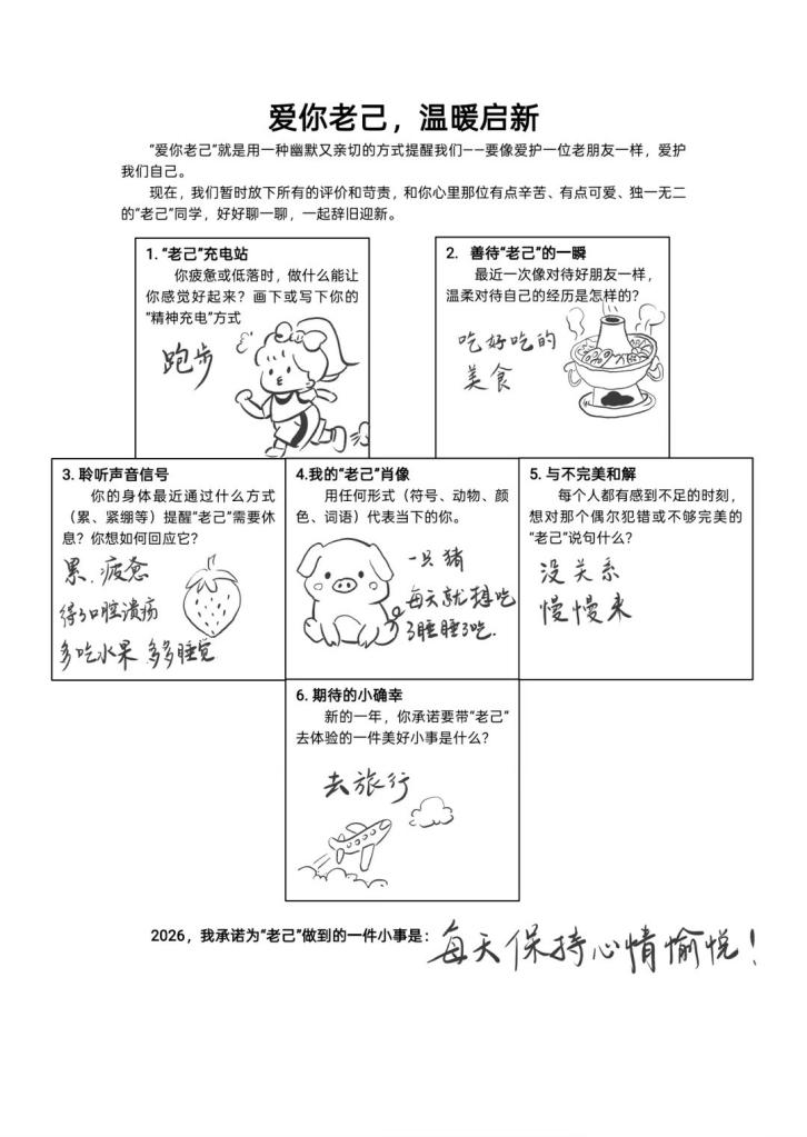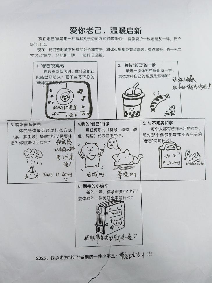 本次活动面向学院全体学生,参与者每日围绕“老己充电站”“与不完美和解”“期待的小确幸”等主题,以文字结合图片的方式在专属QQ群相册中进行打卡分享。七天循序渐进的主题设计,帮助同学们在忙碌的学习生活中停下脚步,倾听内心、关照自我。活动中,同学们用真诚的文字记录成长感悟,用温暖的图片描绘内心柔软。不少同学表示,通过七天的坚持,不仅学会了新的自我关怀方式,也在分享中感受到同伴的共鸣与鼓励。